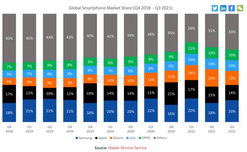 En 2021, la marca china Xiaomi, que se dedica al diseño, desarrollo y comercialización de dispositivos electrónicos, se posicionó como el tercer vendedor de teléfonos celulares, con alrededor del 13% de la cuota total de mercado, según datos de Market Monitor Service.