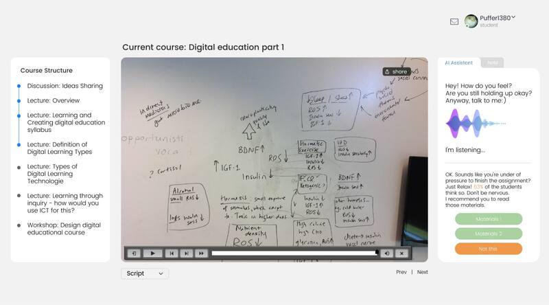 Por medio de un número de identificación individual anónimo, los estudiantes pueden, opcionalmente, iniciar sesión en un tablero integrado desde sus plataformas educativas e interactuar con su asistente de inteligencia artificial que detecta su estado emocional a través del reconocimiento de voz. Esta sencilla herramienta implementa la computación afectiva (inteligencia emocional artificial para la detección en tiempo real) y ofrece, a la emoción detectada, una conversación empática hacia recomendaciones personalizadas (en forma de podcast, conferencias, videos, enlaces externos) ya sea para motivar e inspirar. ellos o para reforzar un resultado positivo.