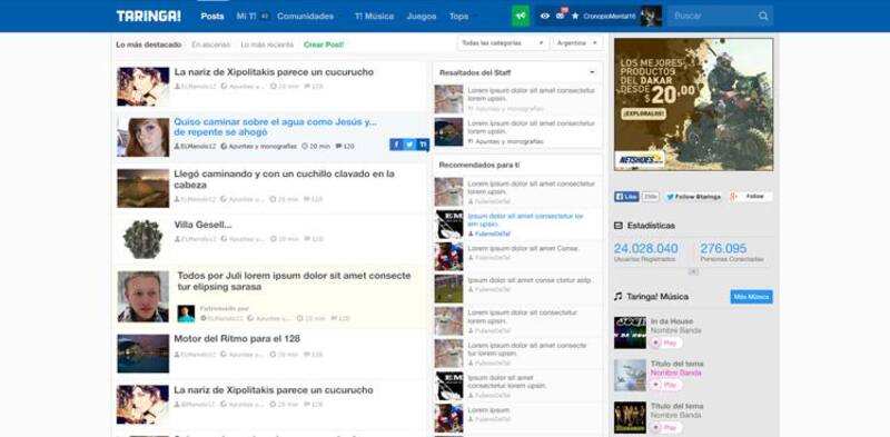 La nueva home de Taringa! tal cual la ve un usuario tras hacer log in. En dos semanas estará disponible para todos.