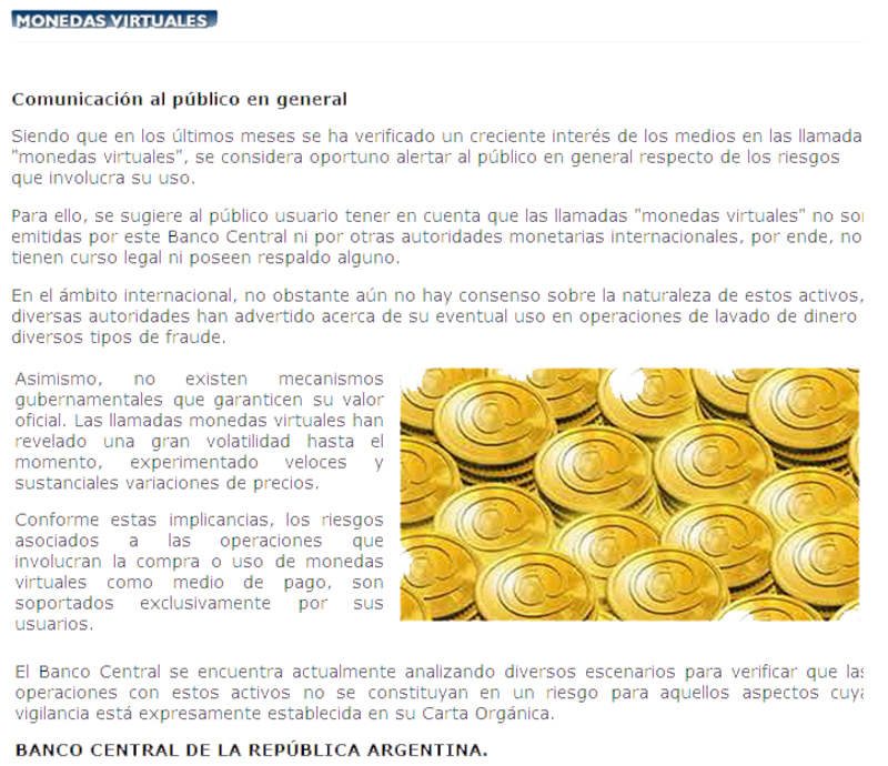 El Banco Central de la República Argentina (BCRA) emitió un comunicado en el que "alerta al público respecto de los riesgos que involucra el uso" de las monedas virtuales.