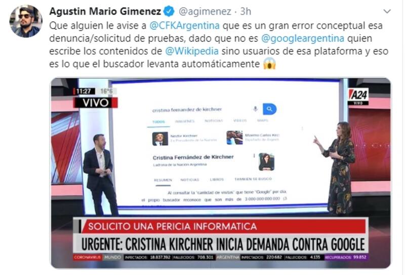 “Que alguien le avise a @CFKArgentina que es un gran error conceptual esa denuncia/solicitud de pruebas, dado que no es @googleargentina quien escribe los contenidos de @Wikipedia sino usuarios de esa plataforma y eso es lo que el buscador levanta automáticamente , publicó.