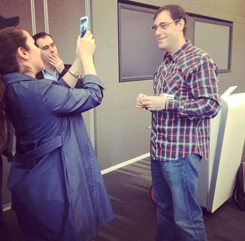 Narda Lepes le toma una foto a Santiago Bilinkis probando Google Glass. Crédito: Instagram - @eavogadro