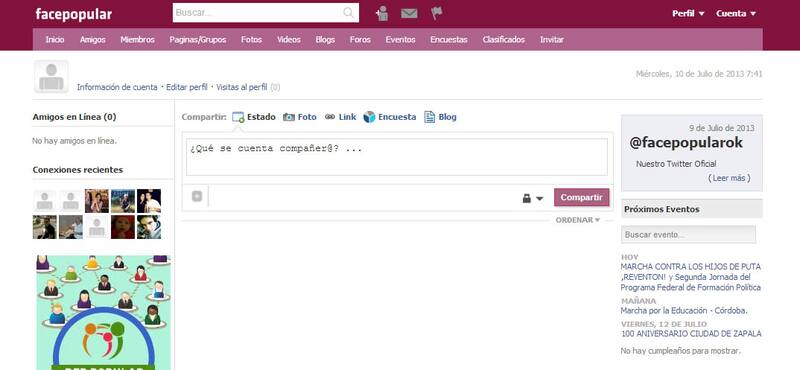 "¿Qué se cuenta compañer@?". Así recibe a un nuevo usuario Facepopular, una nueva red social, que modifica el clásico "qué estas pensando" de Facebook por una pregunta con tintes nac&pop. La misma fue creada por las mismas personas detrás de la campaña 8N Yo no voy y del sitio kirchnerista Puertas Abiertas. El sitio replica la estética de Facebook pero reemplazando el color azul distintivo de la empresa por uno con tintes violáceos.