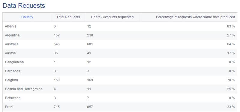 Facebook lanzó un informe en donde detalla la cantidad de pedidos de datos sobre usuarios que se emitieron desde distintos países del mundo en los primeros seis meses de 2013. En este reporte se muestran la cantidad de países que pidieron información, el número de pedidos realizados desde esas naciones, la cantidad de cuentas involucradas y el porcentaje en donde, al menos, se brindó algún tipo de información a pedido de la Justicia.