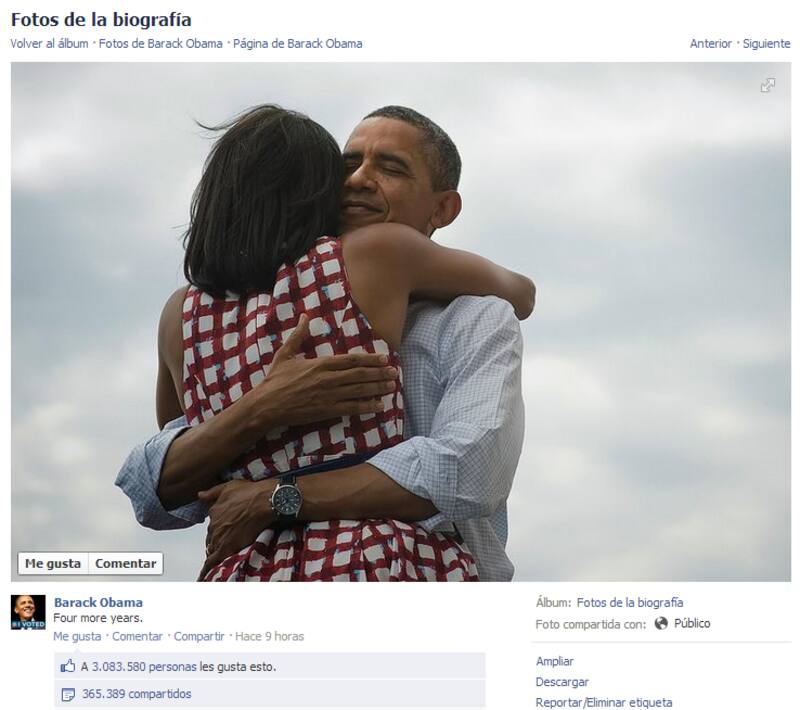Los ojos del mundo se centraron en una sola persona ayer a la medianoche. El presidente Barack Obama fue reelecto en su cargo en los Estados Unidos por cuatro años más. Y ese fue el mensaje que dejó en Twitter y hizo que los servidores de la red social vieran más de 630.000 retweets hasta el momento, siendo la publicación más retwitteada de la historia de Obama. Según Media Bistro, este tweet no rompió solamente los récords personales del reelecto presidente, sino que también de la historia de Twitter superando a un tweet de Justin Bieber que acumuló 223.376 retweets.