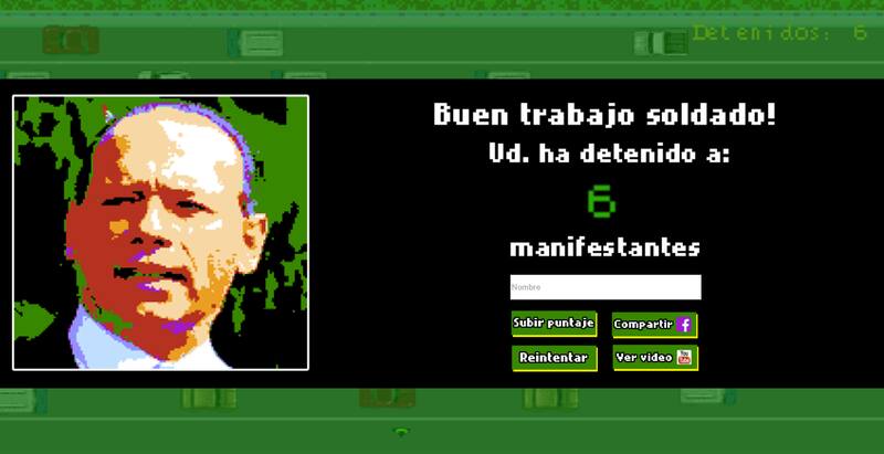 Durante el juego un militar relata cómo hay que hacer para enviar a los militares contra los autos y frenar a los conductores de los vehículos. Cuando termina la partida, la cara del secretario de Seguridad, Sergio Berni, aparece felicitando al usuario por la cantidad de manifestantes arrestados: "¡Buen trabajo soldado!".