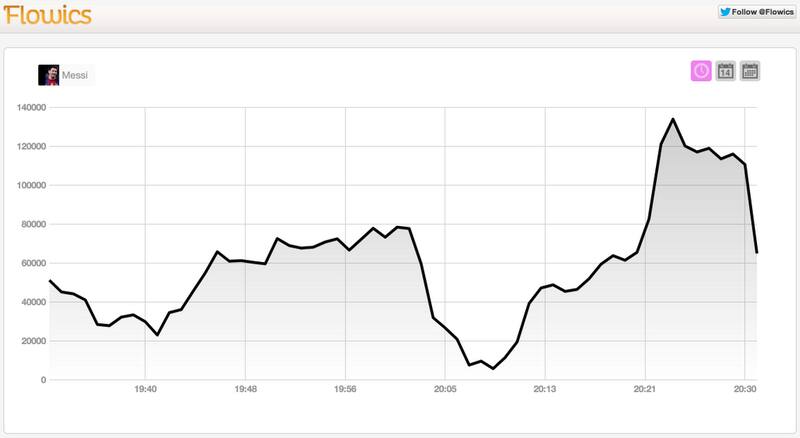 Por otra parte, durante la primera parte del partido, Messi nunca superó los 80.000 tuits en el mismo minuto. Sin embargo, al minuto después de su gol alcanzó un pico de 134.000 publicaciones.