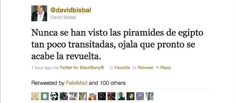 . Por ejemplo, el músico David Bisbal twitteó un chiste durante las revueltas en Egipto, sosteniendo que las pirámides se encontraban muy solas hasta que terminara el conflicto. La publicación comenzó a ser criticada duramente por las redes sociales y el cantante borró el tweet. Contrario a lo que hubiera imaginado, eliminar la publicación solo perjudicó a Bisbal quién fue protagonista de cientos de tweets que se burlaban de él y criticaban su comentario.