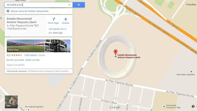 Cuatro días después de que River se clasifique a cuartos de final en la Copa Libertadores 2015, el club millonario se encontró con una sorpresa en Google Maps. Si se escribe la frase “te fuiste a la B” en el buscador del servicio de mapas de Google, el sistema redirige al usuario al Estadio Monumental Antonio Vespucio Liberti.