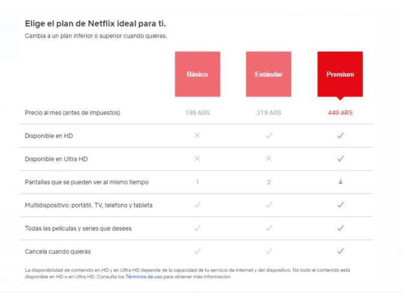 Por último, el plan Premium, que permite reproducir material en hasta cuatro dispositivos en simultáneo y en definición Ultra HD –y utilizado en el cálculo de Infotechnology-, posee un valor de $ 449 que, multiplicado por la cantidad de meses, alcanza los $ 5.388.