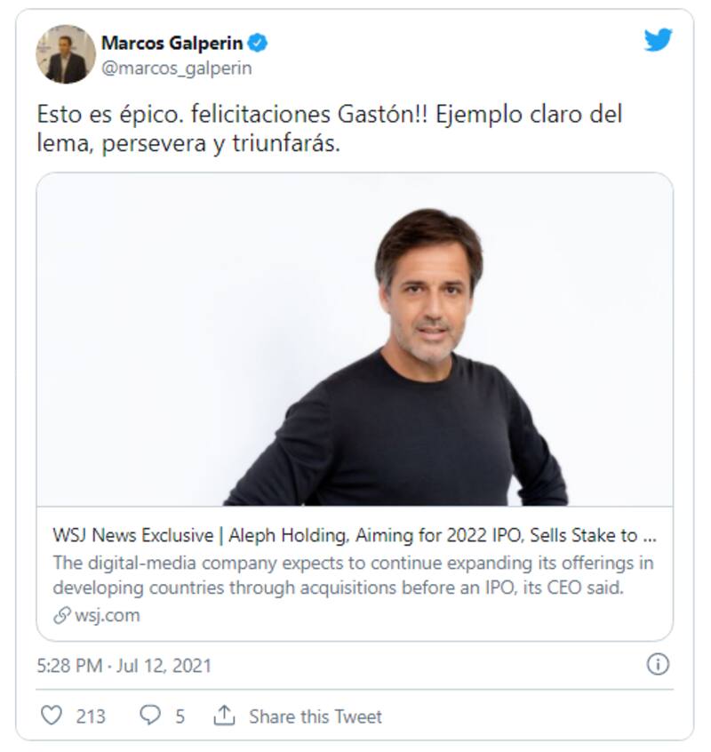 En esta línea, en el día de ayer, el empresario celebró el éxito de Aleph y su inminente llegada a la bolsa de Nueva York en 2022 a través de su cuenta oficial de Twitter.