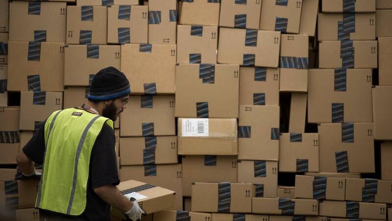 Un empleado acomoda cajas en un centro de la empresa en Phoenix, Arizona.