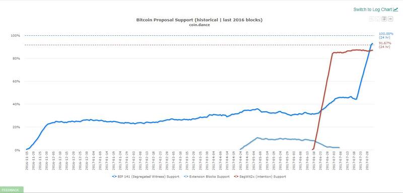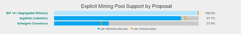 En las últimas horas, los exchanges (quienes guardan, venden y realizan transacciones de criptomonedas), monederos y nodos implementaron sin problemas una modificación leve o soft fork (versiones derivadas de un software) conocida como SegWit (acrónimo en inglés de Testigo Segregado), que promete mejoras en el código hasta la llegada de SegWit2.x, planeada para noviembre que terminará de cementar las nuevas modificaciones técnicas que permiten funcionar a Bitcoin. Esta es la solución más popular entre los usuarios de la moneda digital.