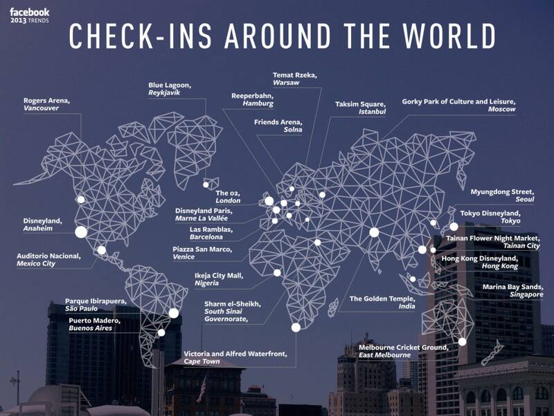 Por otra parte, Facebook comunicó cuáles fueron los lugares con más check-ins de distintas partes del mundo. En la Argentina, Puerto Madero se destaca como el sitio con más check-ins. En Estados Unidos, aparece Disneyland de California como la principal locación, mientras que en Brasil aparece el Parque Ibirapuera en San Pablo y en Italia la Piazza San Marco, en Venecia, entre otros países.