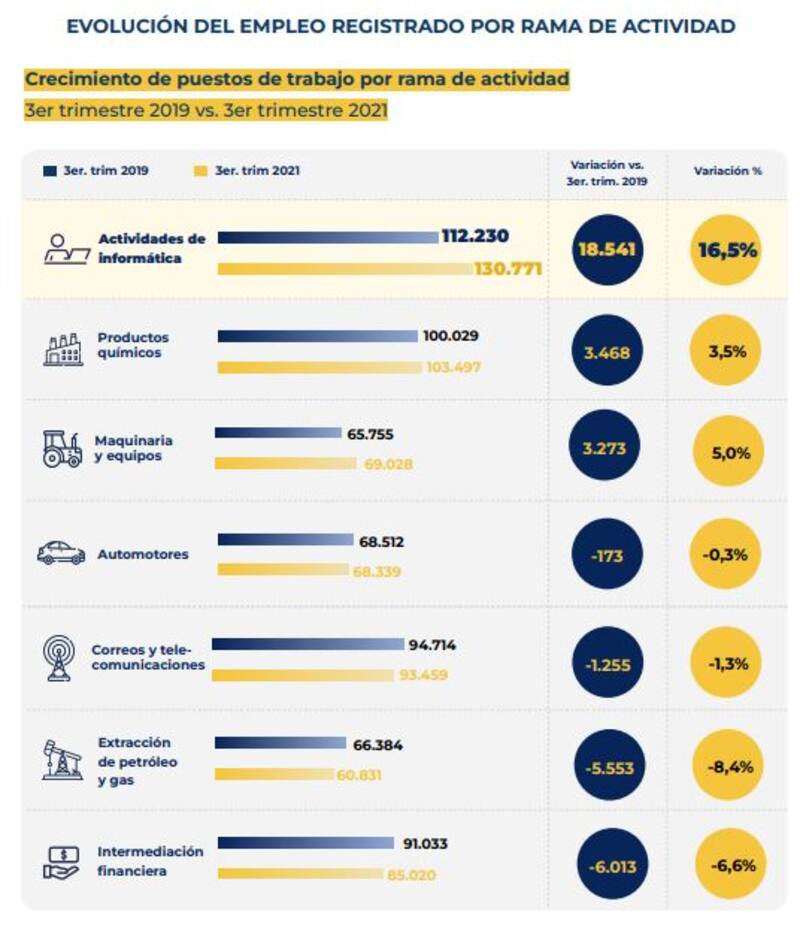 Según este estudio, se generaron 18.541 nuevos puestos de trabajo en actividades de informática entre 2019 y 2021, lo que representa un crecimiento del 16,5% en los últimos dos años -llegando a ser la actividad de más de 50 mil empleados que más trabajo generó en el país-.