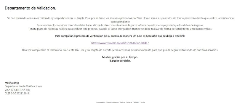 Desde el día jueves por la noche están llegando correos electrónicos, supuestamente desde la compañía VISA, alertando a los usuarios sobre un problema con su tarjeta y sus pagos. El correo aduce que se han "realizado consumos reiterados y sospechosos en su tarjeta Visa, por lo tanto los servicios prestados por Visa Home seran suspendidos de forma preventiva hasta que realize la verificacion correspondiente". A continuación, el supueto mail le pide al usuario que ingrese a un enlace donde va a poder realizar un trámite en línea para arreglar el problema.