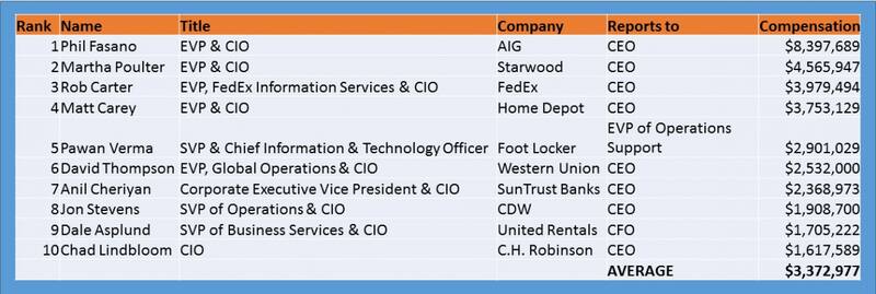 El promedio de ingresos de los CIO mejor pagos en Estados Unidos es de US$ 3.372.977, mientras que el primero -Phil Fasano, de la aseguradora AIG- se lleva US$8.397.689 al año y el último Chad Lindbloom, CIO de la compañia de legística C.H Robinson, gana US$ 1.617.589 anuales.