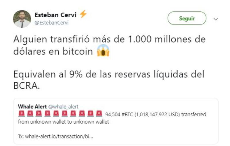 Las repercusiones llegaron incluso hasta nuestro país, donde un usuario de Twitter tuvo la idea de comparar la transacción con la liquidez de las reservas del BCRA.