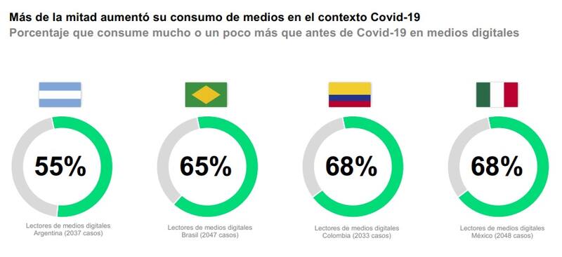 La búsqueda de información a través de medios digitales experimentó un importante crecimiento en la Argentina durante la pandemia de Covid-19, a tal punto que el 55% de los lectores de esas plataformas en el país incrementó su consumo de noticias.