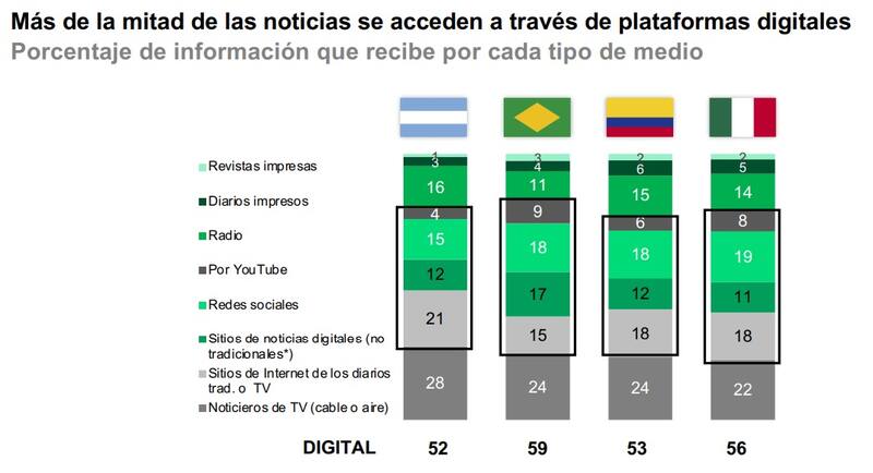 El trabajo, que encuestó a 8570 personas de entre 18 y 65 años en Argentina, Brasil, Colombia y México, encontró también que un 14% de los encuestados en la Argentina están dispuestos a pagar una suscripción por noticias digitales, porcentaje mayor que en algunos otros países, incluidos los mercados establecidos como el Reino Unido (8%) y Alemania (10%), y un poco por detrás de los Estados Unidos (20%).