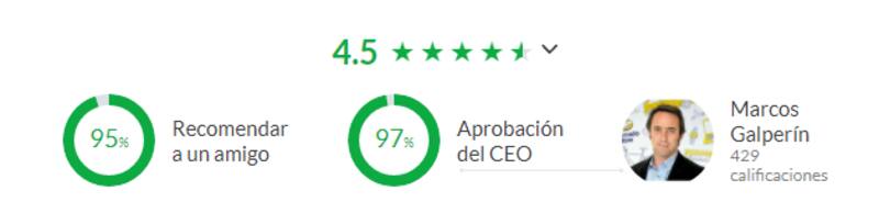 En la misma plataforma, Mercado Libre tiene una evaluación del 4.5 y el 97% de las personas aprueban la labor de Galperin como CEO. En cuanto a cuestiones negativas, algunos usuarios anónimos comentaron que "no saben si hay grandes desventajas"; otros dijeron que "se trabaja los sábados o domingos". "Ninguna, es una empresa casi perfecta", aseguran.