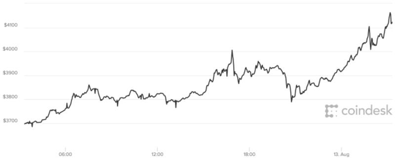 Hace 24 horas la criptomoneda estaba operando por debajo de US$ 3,700. En menos de 24 horas, pasó a superar los US$ 4.000 y no parece que vaya a detenerse. En este momento, se negocia por alrededor de US$ $4287.03. Como referencia, hace una semana Bitcoin alcanzó un récord histórico, ya que pasó los US$ 3.000 por primera vez.