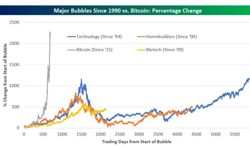 Hay otro paralelismo que se puede hacer respecto a la euforia de las puntocom. El Bespoke Investment Group contrastó el aumento de Bitcoin con las burbujas del mercado de tecnología a finales de los años ’90: casi no hay comparación. Las acciones de tecnología subieron un poco más de 1000 por ciento durante todo el curso de su burbuja, y Bitcoin ya sube más del doble sin que nadie pueda afirmar que se viene el estallido.