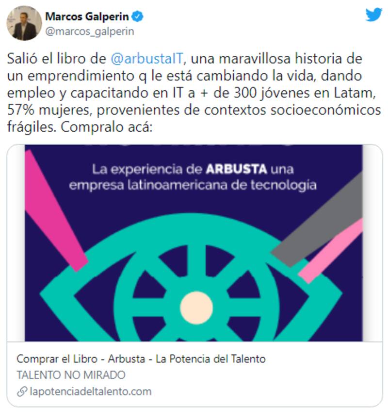 "Salió el libro de Arbusta, una maravillosa historia de un emprendimiento que le está cambiando la vida, dando empleo y capacitando en tecnología a más de 300 jóvenes en América Latina. El 57% son mujeres, provenientes de contextos socioeconómicos frágiles", tuiteó Galperin a finales del año pasado sobre el libro.