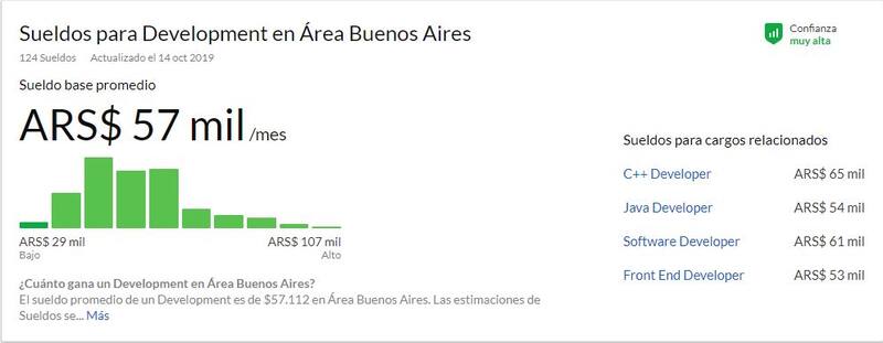 Con requerimientos similares se puede encontrar también el puesto de desarrollador. Nuevamente, puede verse cuál sería el salario promedio para este puesto en Argentina.