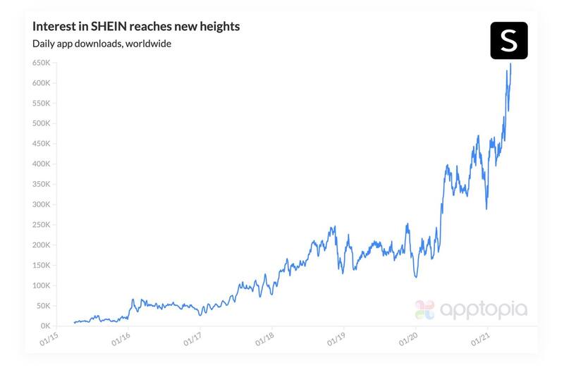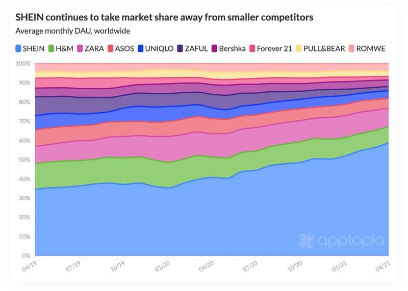 Hoy en día, Shein es más popular que Zara, Uniqlo, Forever 21 y H&M y los expertos creen que podría superar a Amazon. Según datos de Apptopia, abarca casi el 60% de la cuota de mercado de venta de indumentaria en línea.