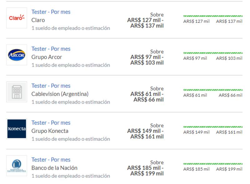 En segundo lugar, un tester supera los $65.000 mensuales y alcanza los $130.000 en empresas grandes como Claro y Grupo Arcor.