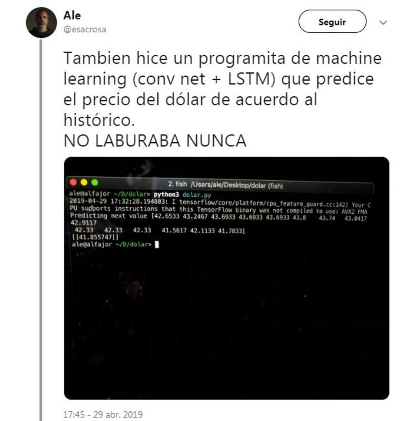 El especialista informático, que supo desempeñarse en Twitter y Linkedin y hoy trabaja en Dashbase, Alejandro Crosa es también un famoso tuitero. Recientemente, mostró a sus seguidores su última criatura: una pieza de software que permite "predecir" el precio del dólar.