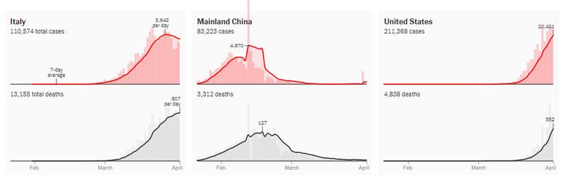 Según los últimos datos de The New York Times y la Universidad Johns Hopkins, en Italia, el número de casos nuevos parece estar estabilizándose, probablemente debido a los estrictos esfuerzos de cierre del país. Pero el número de muertos continúa aumentando, y las autoridades de salud dicen que el país aún no ha alcanzado su punto máximo.