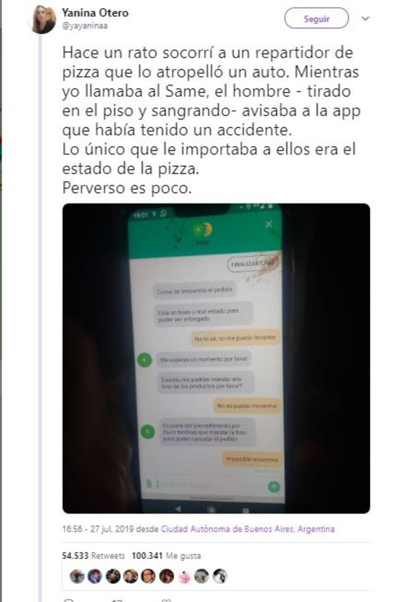La historia la dió a conocer, a través de Twitter, la periodista Yanina Otero de Ámbito Financiero. "Hace un rato socorrí a un repartidor de pizza que lo atropelló un auto. Mientras yo llamaba al Same, el hombre - tirado en el piso y sangrando- avisaba a la app que había tenido un accidente", relato Otero.