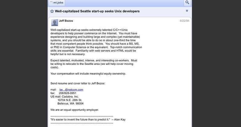 Amazon buscó en 1994 el que sería el "primer empleado de Amazon". Jeff Bezos detalló una larga lista de requisitos y su paga sería "un porcentaje de la empresa". Quién fue empleado, sigue siendo un misterio.