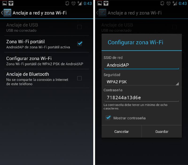 1) Lo primero que hay que hacer es saber la contraseña para conectar al celular con la PC. Para hacer esto entrar a la Configuración y luego a Conexiones y zona Wi-Fi, luego hacer clic en Configurar la zona Wi-Fi: aparece una ventana con el nombre de la red y la contraseña (hacerla visible cliqueando en Mostrar contraseña), a ambas las debemos anotar. Personalmente, aconsejo cambiar la contraseña por una fácil de recordar. Cuando terminamos, clic en Guardar.