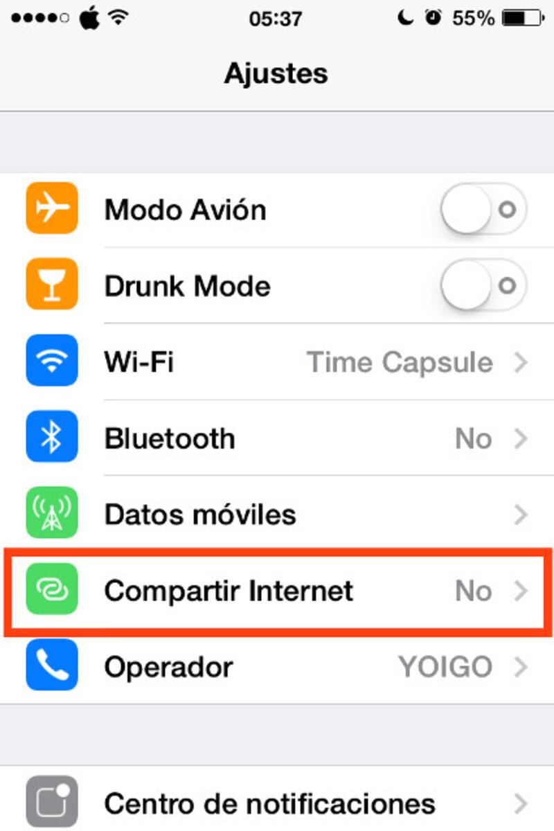 1) Ir a Ajustes y hacer clic en Compartir Internet. Antes, igual que con Android, es posible cambiar la contraseña en, adecuadamente, Contraseña Wi-Fi.