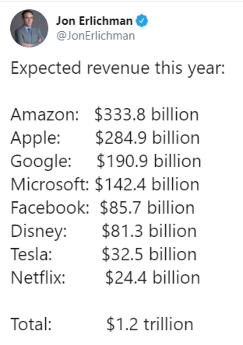 Según un tuit del periodista Jon Erlichman (@JonErlichman), la suma de los ingresos previstos por todas estas compañías asciende a US$ 1,2 trillón.