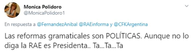 “La RAE le dio la razón a Cristina: se dice «presidenta» Para el organismo que se dedica a la elaboración de reglas normativas para el idioma español utilizar el término ‘presidenta’ para una mujer es la ‘opción más adecuada’ , posteó el actual presidente e incluyó las cuentas de la entidad @RAEinforma y de la propia Cristina @CFKArgentina