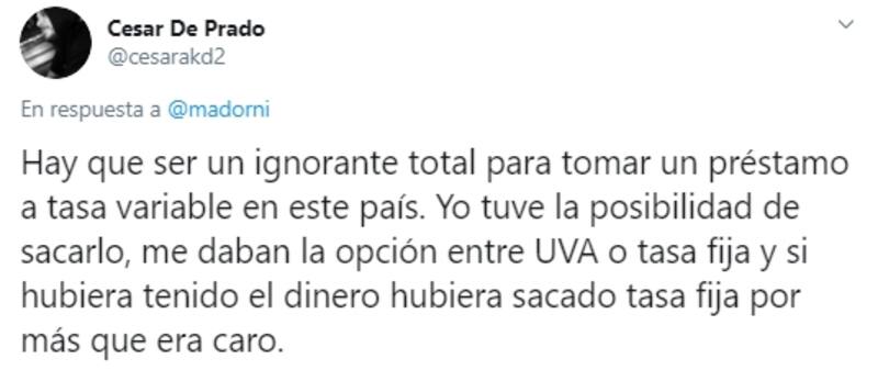 “Se aprobaron en el Congreso, los promovió el Ejecutivo y los otorgaron bancos estatales en su mayoría. Quienes los tomaron no planearon un negocio sino evitar alquileres también impagables. #HipotecadosUVA , publicó.