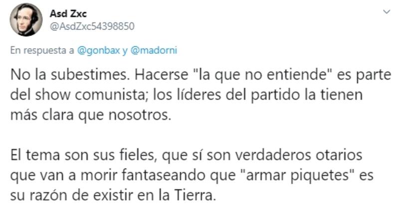 No obstante, casi de forma inmediata, el analista y consultor económico Miguel Adorni le respondió a la militante, también por su cuenta de Twitter (@madorni).