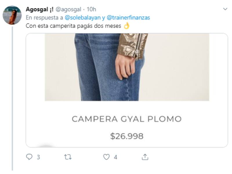 Otros usuarios citaron precios aún más altos, como una campera "Gyal Plomo" que tiene un valor de $ 26.998 o una parka 3-en-1 para mujer de $ 27.545. Lo mismo que un mes de un departamento de la zona de Palermo o Las Cañitas (siempre sin sumar las expensas).