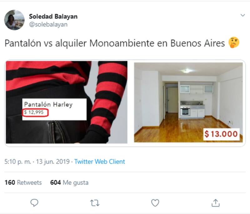 Una usuaria de Twitter, Soledad Balayan (@solebalayan), hizo una comparación que es, tal vez, un poco injusta: un pantalón de Paula Cahen D'Anvers -modelo "Harley"- de $ 12.995 con un monoambiente de $ 13.000 por mes. Es decir, un pantalón cuesta lo mismo que un mes de alquiler.