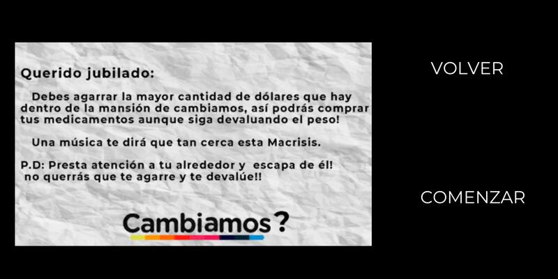 “Querido jubilado: Debe agarrar la mayor cantidad de dólares que hay dentro de la mansión de Cambiamos, así podrás comprar tus medicamentos aunque siga devaluando el peso. Una música te dirá que tan cerca está Macrisis. PD: Prestá atención a tu alrededor y escapá de él! No querrás que te agarre y devalúe! Cambiamos? , remarca, a modo de introducción, la pantalla previa antes de empezar.