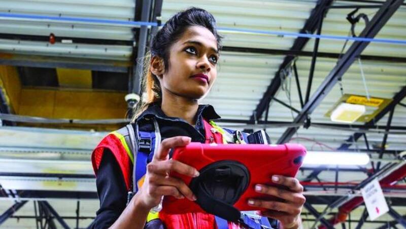 La vestimenta se completa con completa con pantalones vaqueros y zapatillas deportivas. Sin embargo, lo importante es que con solo apretar un botón, estos jóvenes empleados consiguen ingresar a otra área donde se mueven al unísono cientos de robots color naranja transportadores.