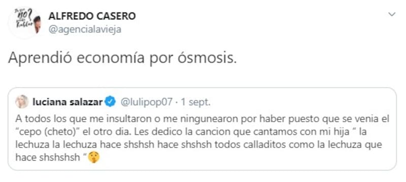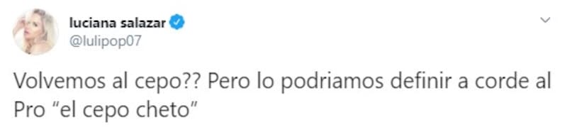 No obstante, otros reconocidos usuarios aprovecharon para criticarla, sobretodo, luego que el viernes pasado, Salazar anticipara el “cepo del dólar a través de su cuenta personal de Twitter.