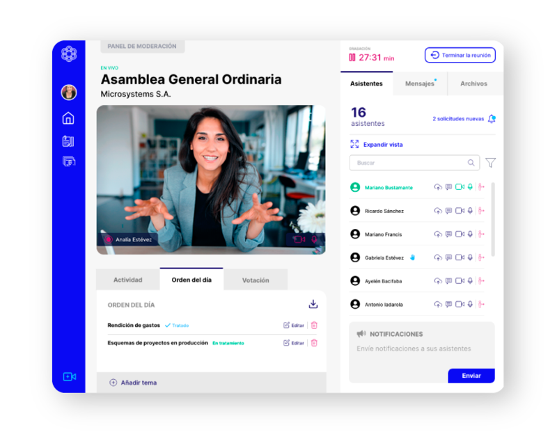 Según la empresa, su objetivo es "recrear todas las etapas y procedimientos legales, reglamentarios y estatutarios necesarios para llevar adelante una reunión de manera totalmente virtual". Por ejemplo, esta tecnología permite parametrizar a los asistentes según requerimientos estatutarios y según sus particularidades (ya sea que fueran apoderados con representación múltiple, acciones con más de un voto, requisitos de quórum por tema, elección de directores u otros).