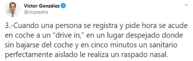 Para el diputado, esta medida evita el sistema absurdo de las ambulancias del 112 yendo a domicilios a realizar pruebas. Además, elimina el riesgo de contagio de los sanitarios porque no hay prácticamente contacto desde el coche.