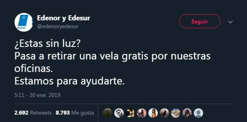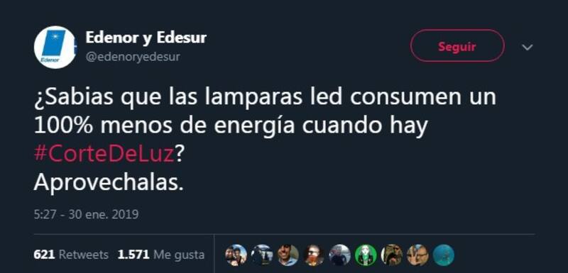 Justamente, uno de sus últimos tuits ironiza: “¿Sabías que las lámparas led consumen un 100% menos de energía cuando hay #CorteDeLuz? Aprovechalas . Rápidamente, el mensaje se hizo viral al conseguir más de 1.500 likes y más de 610 retweets.