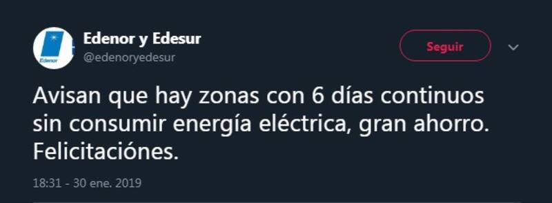 En el mundo se suele decir que la creatividad y el humor de los argentinos son dos de sus grandes virtudes. En esta ocasión, la premisa fue puesta en evidencia una vez más mediante una cuenta falsa o “fake de la red de microblogging Twitter que realiza a chistes con la gran cantidad de cortes de suministro eléctrico que azota a la población cada día.